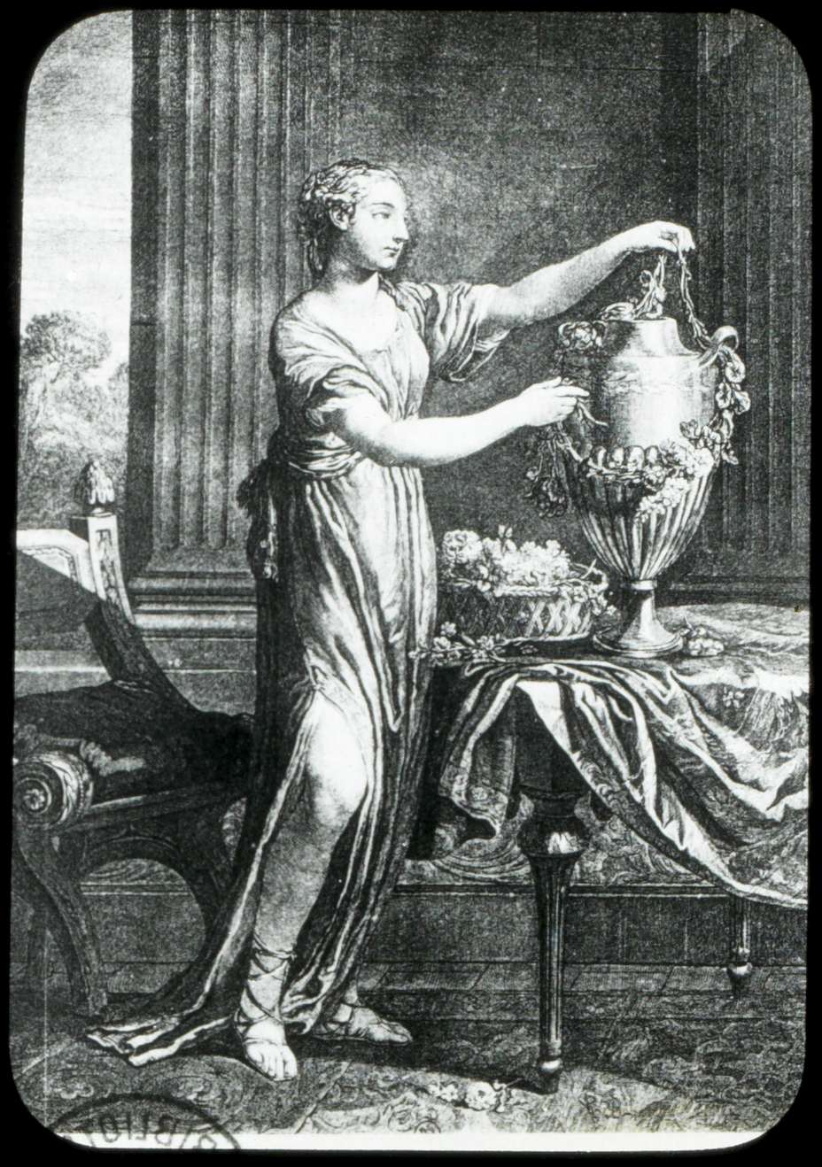 Jeune corinthienne ornant un vase de bronze avec une guirlande de fleur