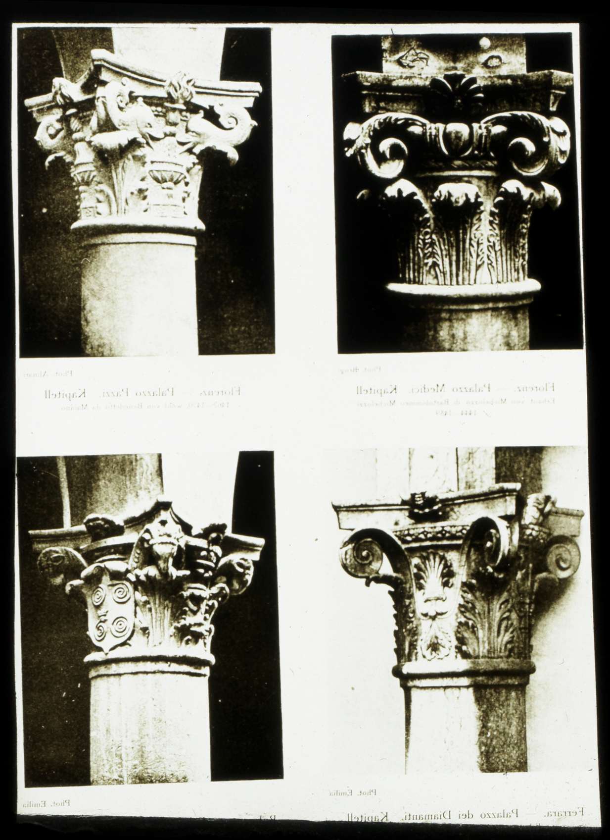 Palais Gondi, chapiteau ; chartreuse de Pavie, chapiteau ; église San Spirito, chapiteau ; église San Domenico, chapiteau